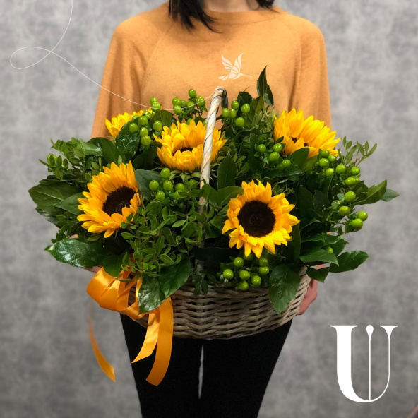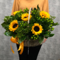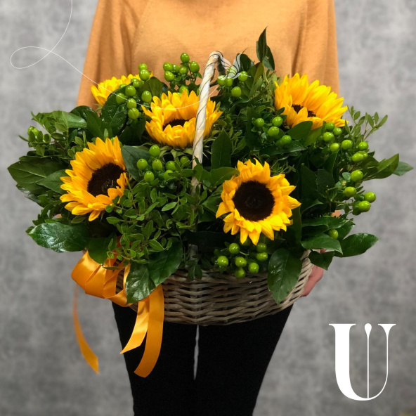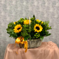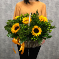 Подсолнухи и белые маттиолы в белой плетенной корзине