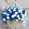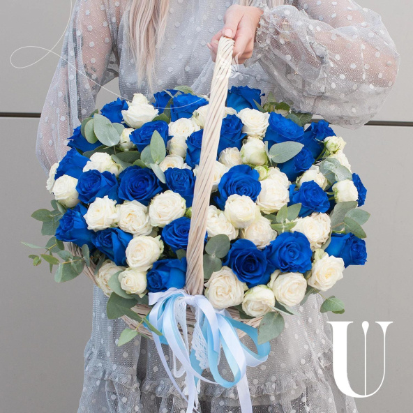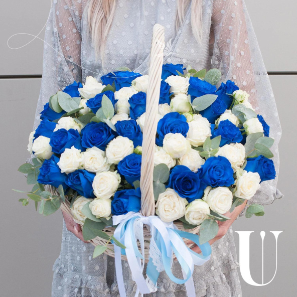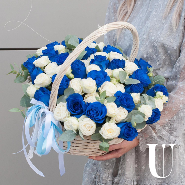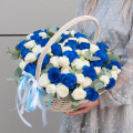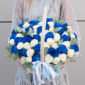 Композиция в корзине выполнена из синих роз и белых пионовидных кустовых роз, что придает ей неповторимый и стильный вид.