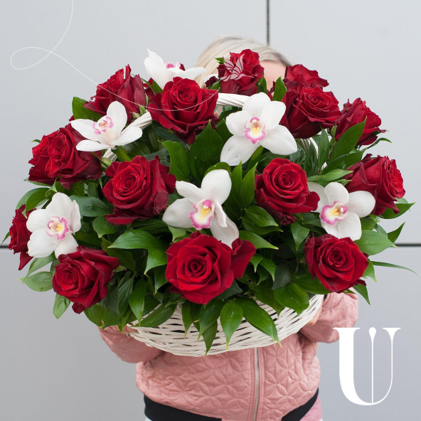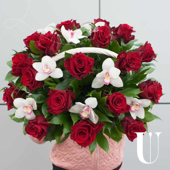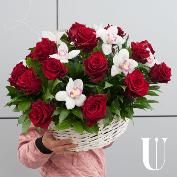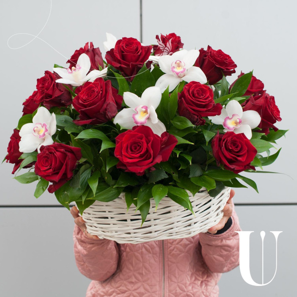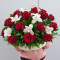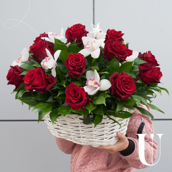 Корзина из красных роз и белых орхидей с зеленью "Яркое поздравление" - это уникальное и стильное решение для подарка на любой праздник.