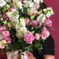 Композиция в розово-сиреневых тонах из гвоздик, альстромерий, хризантем и других цветов в корзине