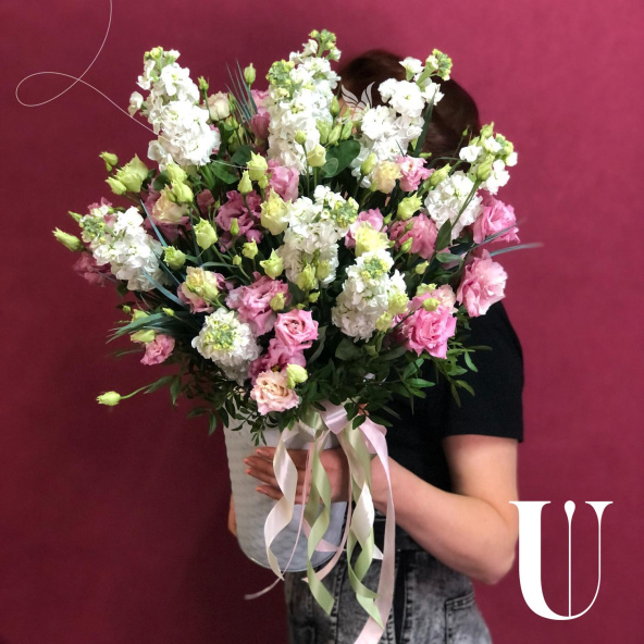 Композиция из розовых пионов, роз Аваланж и белых лизиантусов в белой корзине