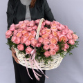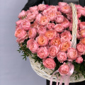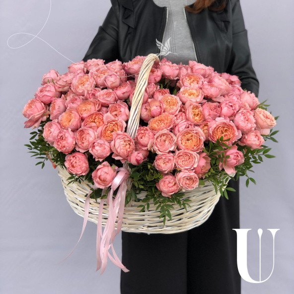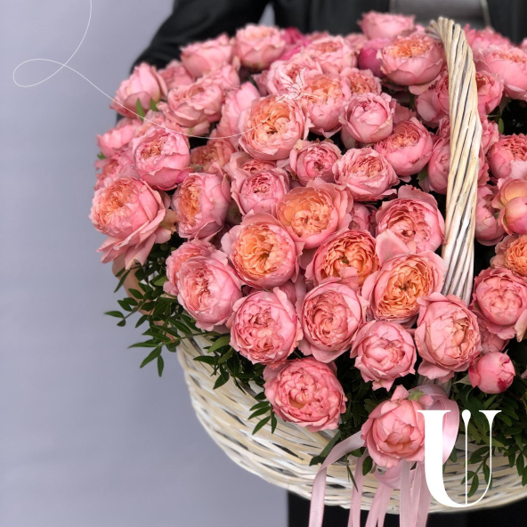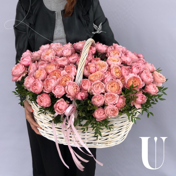 25 розовых пионов в белой плетенной корзине