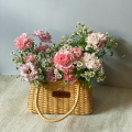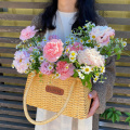 Композиция из желтой альстромерии, розового диантуса и кустовой розы Свит Сара в луговой корзине