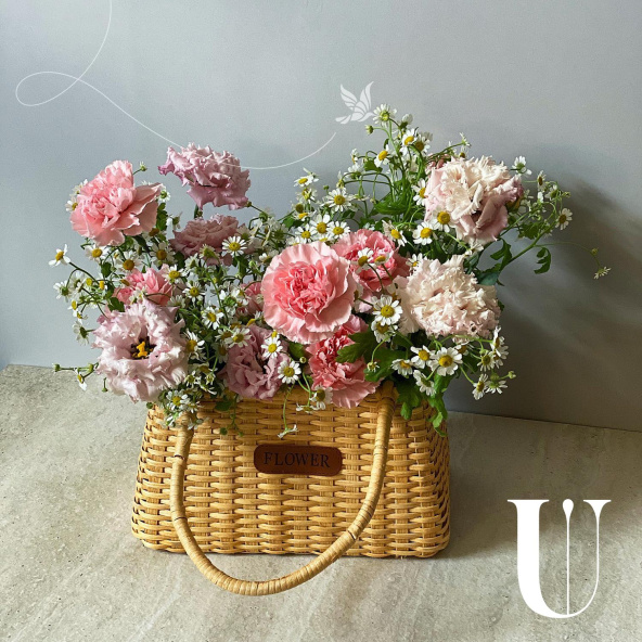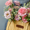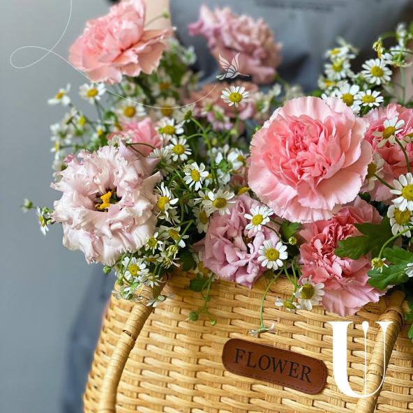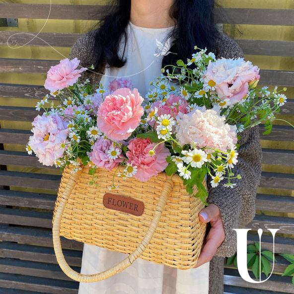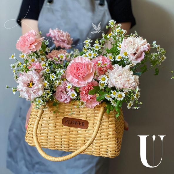 Композиция из нежно-розовых кустовых диантусов, желтых альстромерий и ромашки в корзине