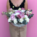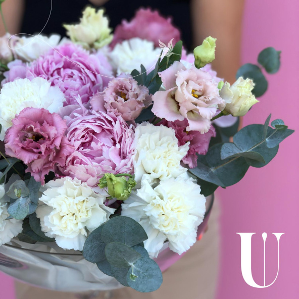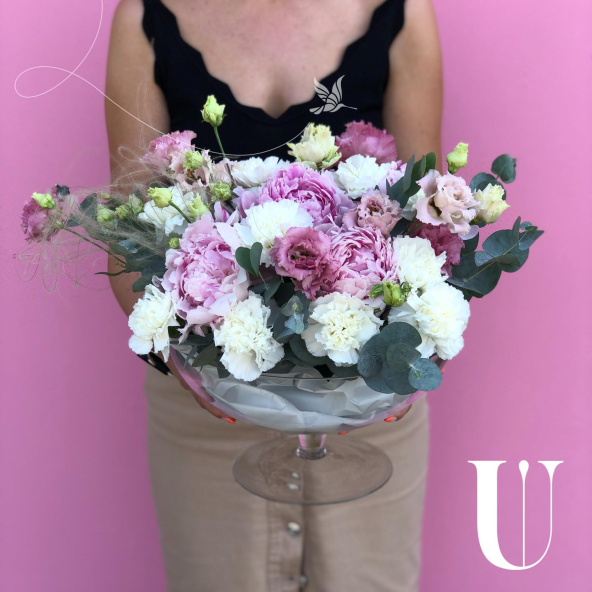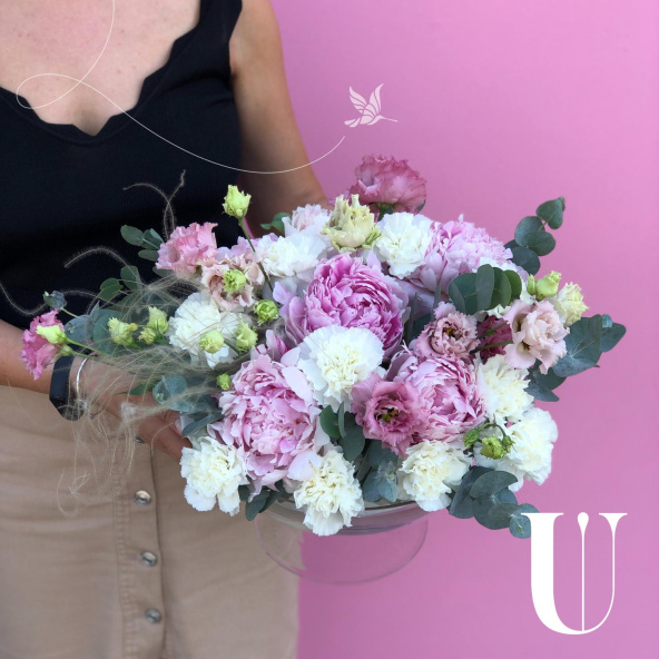 Композиция из розовых пионов, роз Талея и розовых лизиантусов в белой корзине