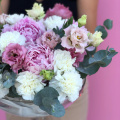 Альстромерии, диантусы, сантини и кустовые розы в корзине