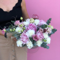 Цветочная композиция из роз Пинк Мондиаль, фиолетовых гортензий, сиреневых кустовых роз и белых альстромерий в корзине