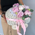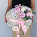 Композиция из кустовых пионовидных роз Мисти Бабблз, роз Миритим и розовых диантусов в белой корзине