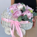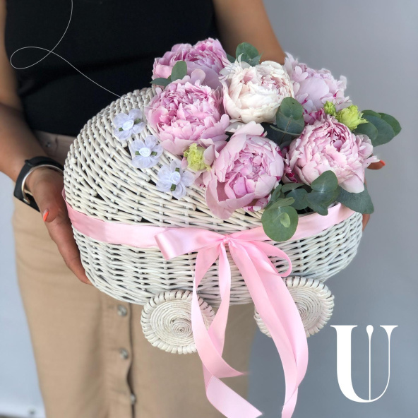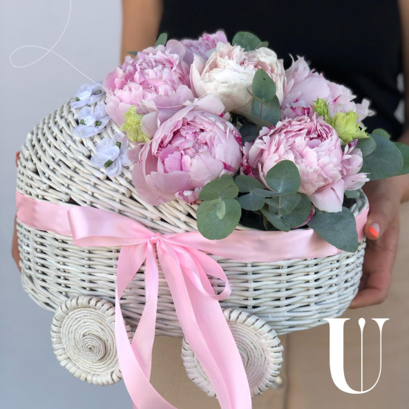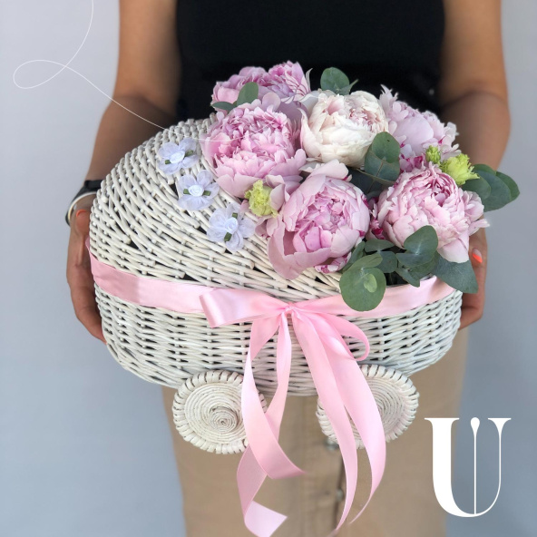 Нежнейшая композиция с пионами в плетеной колясочке ручной работы покоряет с первого взгляда
