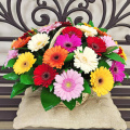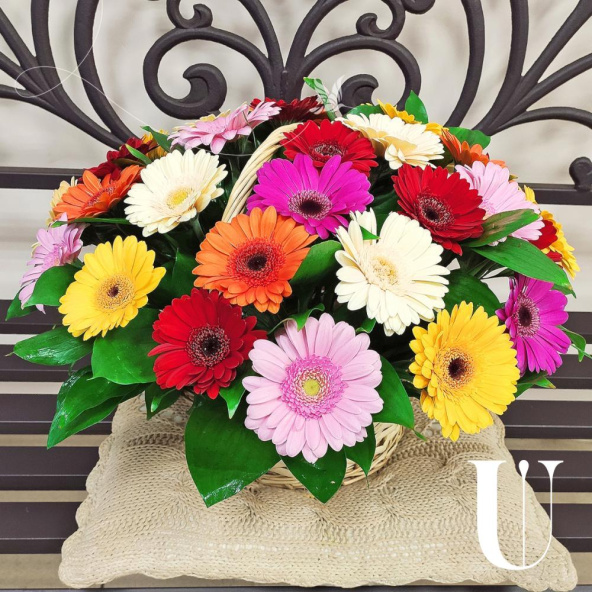 Композиция из роз Миритим, кустовой пионовидной розы Джульетта и белых кустовых хризантем в корзине