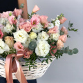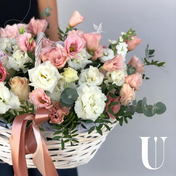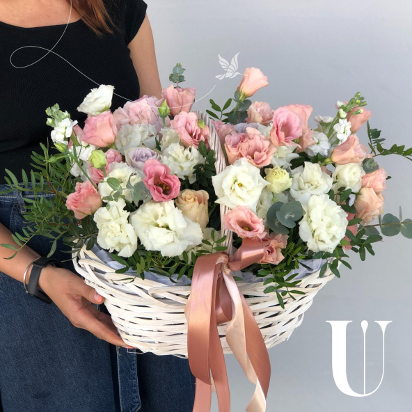 Композиция в нежной гамме из лизиантусов в корзине