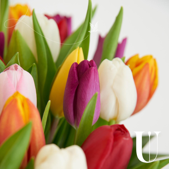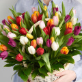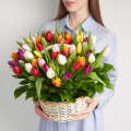Цветочная композиция из диантусов Гипносис, эустом и альстромерий в корзине
