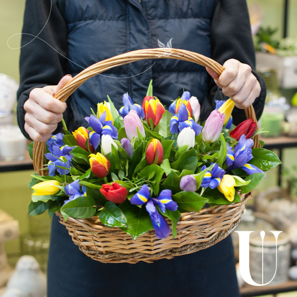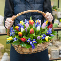 Цветочная композиция из диантусов Гипносис, эустом и альстромерий в корзине