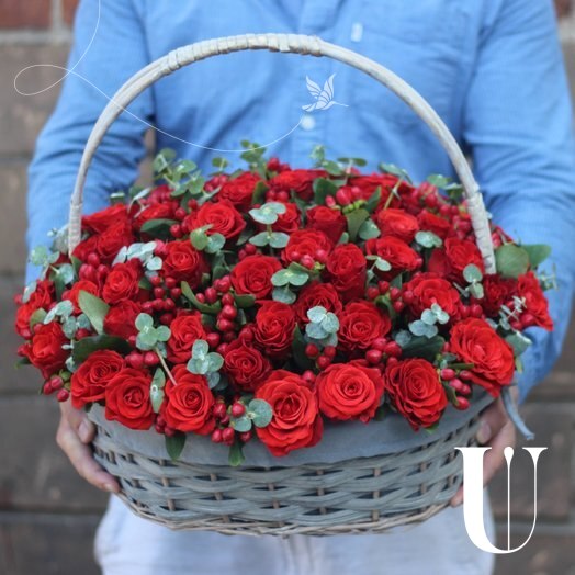 - Красная роза "ред наоми" 50 см - 65 шт, гиперикум красный - 30шт, эвкалипт - 2 пучка