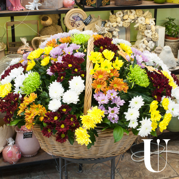 Нежная композиция из орхидей, роз, эустомы и других цветов в корзине