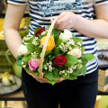 Поэтичная корзина цветов с орхидеями, розами, диантусами и писташем