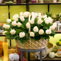 Композиция в белой гамме из кустовых роз, белых фрезий и белых альстромерий в корзине