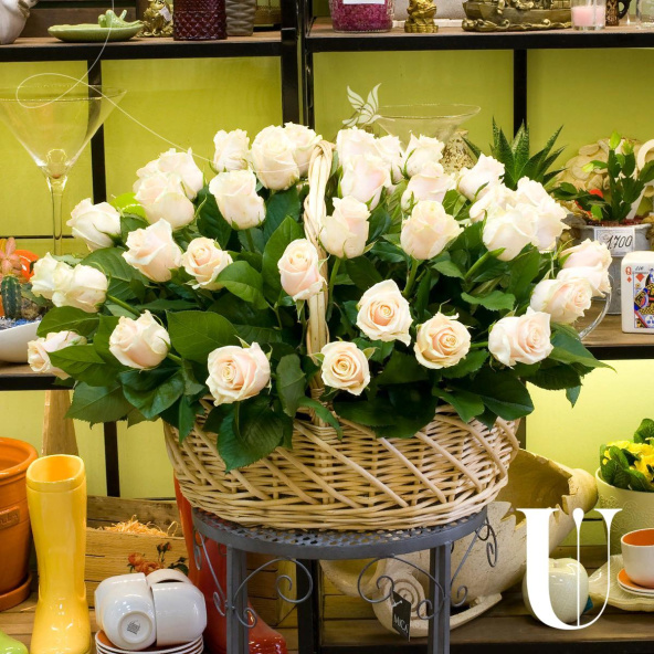 Цветочная композиция из кремовых роз, нежно-розовых диантусов и кустовых роз в корзине