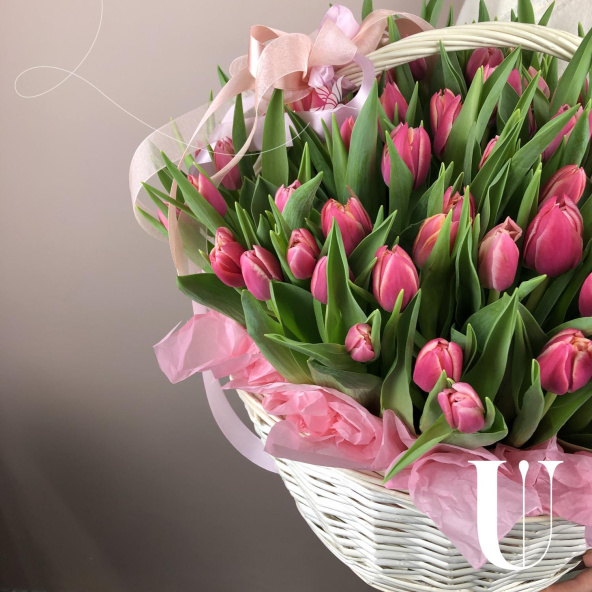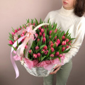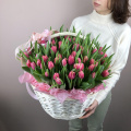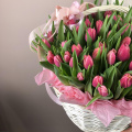 Композиция из розовых кустовых пионовидных роз и розовых маттиол в корзине