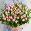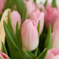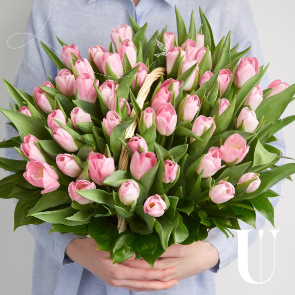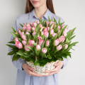 Цветочная композиция из диантусов Гипносис, эустом и альстромерий в корзине