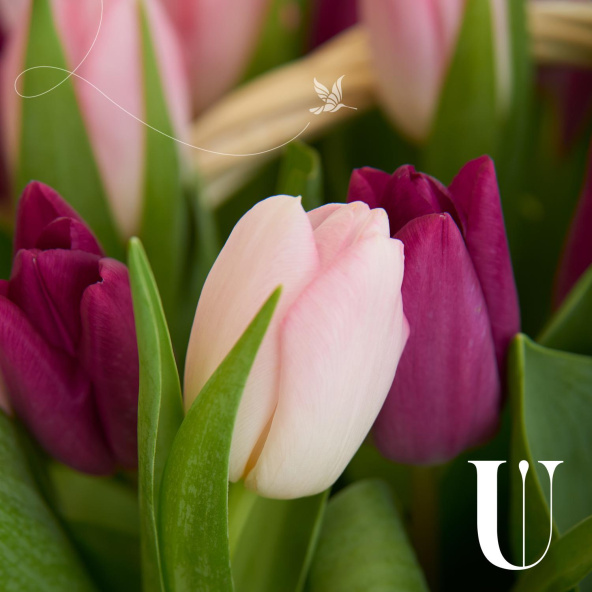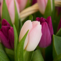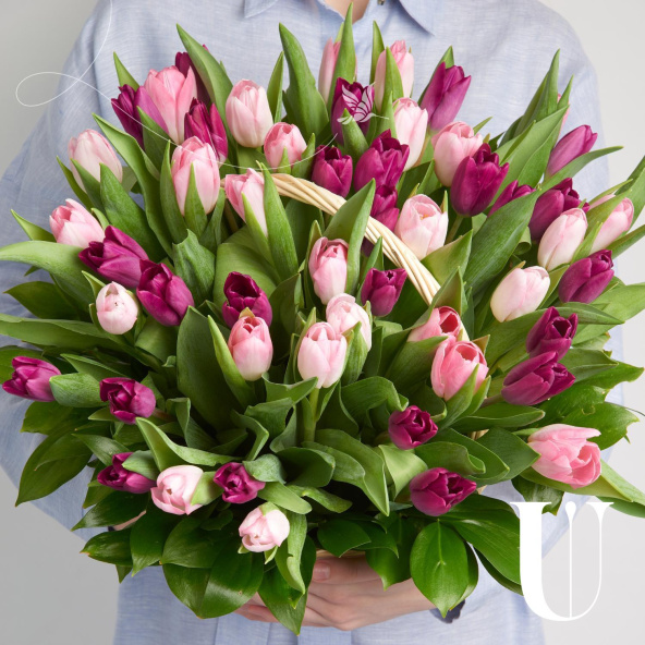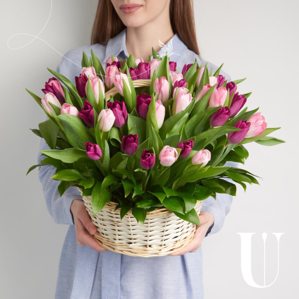 Цветочная композиция из диантусов Гипносис, эустом и альстромерий в корзине