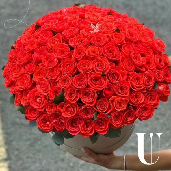 Цветочная композиция из роз Вайт Охара, белых эустом и антуриума в красной шляпной коробке