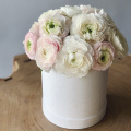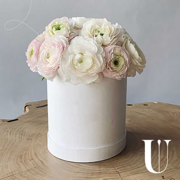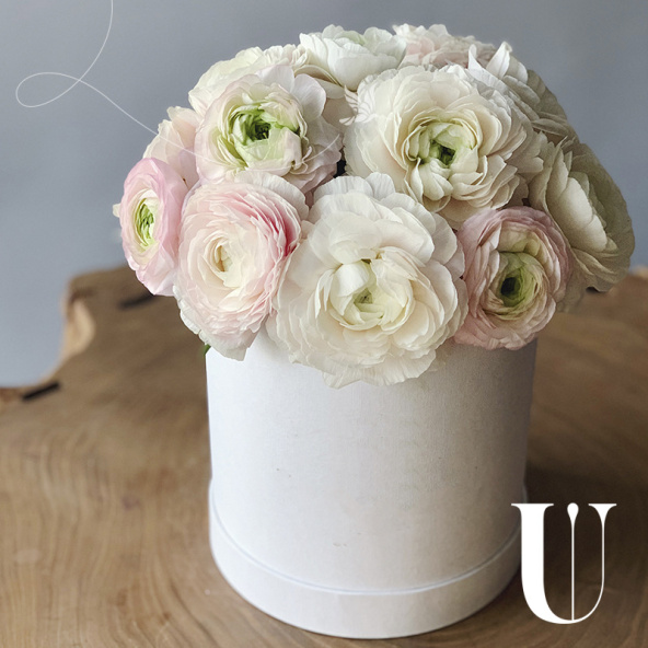 Шляпная коробка - 1 шт., Ранункулусы - 19 шт.