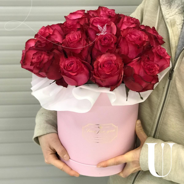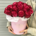 - Цветочная композиция в шляпной коробке. В составе роз Пинк Флойд 25 шт. Композиция собрана в специальной флористической губке