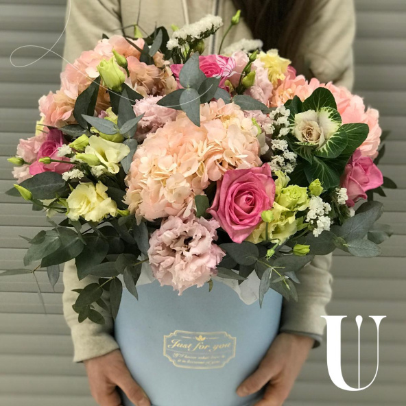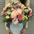 - Цветочная композиция в шляпной коробке. В составе роза 10 шт