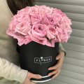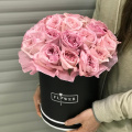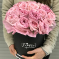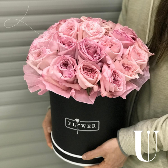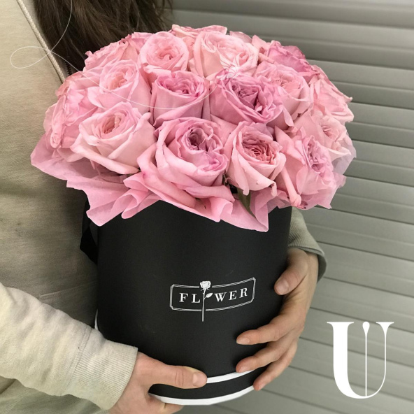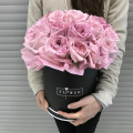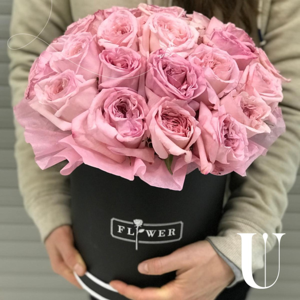 - Цветочная композиция в шляпной коробке. В составе роза Пинк Охара 19 шт Композиция собрана в специальной флористической губке