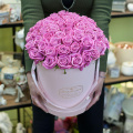 Дизайнерская композиция из розовых орхидей, маттиол и белых роз в розовой шляпной коробке
