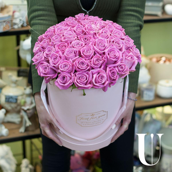 Композиция из роз, эустомы и других цветов в шляпной коробке