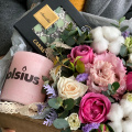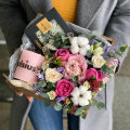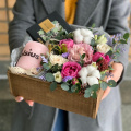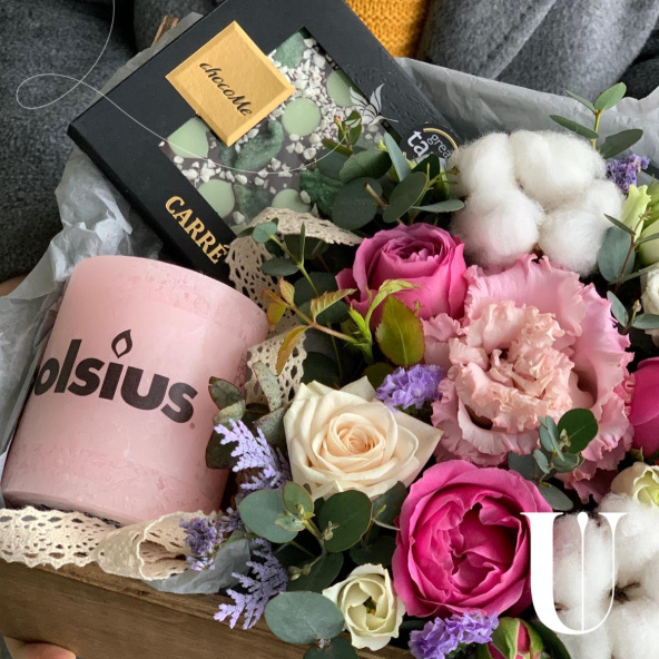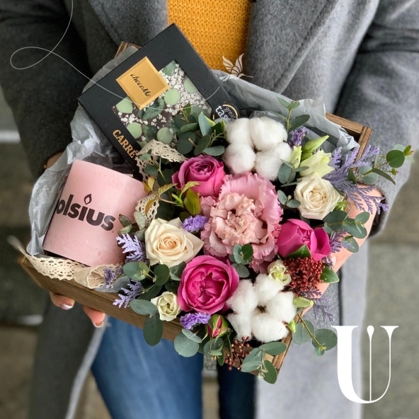 - Ящик - 1 шт. оазис - 1 шт. хлопок - 2 шт. свеча ручной работы - 1 шт.шоколад бельгийский - 1 шт. эустома - 1 шт. роза мисти баблс - 1 шт. роза кустовая - 1 шт. скимия - 2 шт