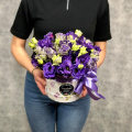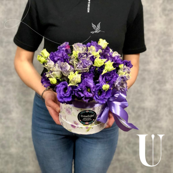 Розовая гортензия и белая гипсофила в розовой шляпной коробке