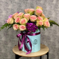 Кустовые розы и эустомы в шляпной коробке