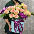 Розы, гвоздики и другие цветы в сиреневой коробке