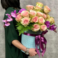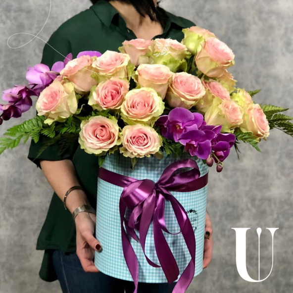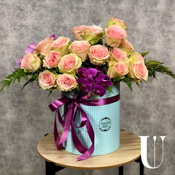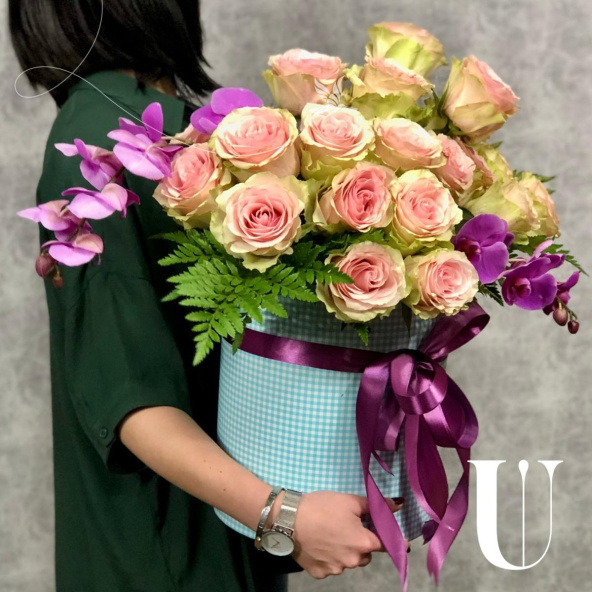 Нежная композиция из орхидей и альстромерий в шляпной коробке маджестик