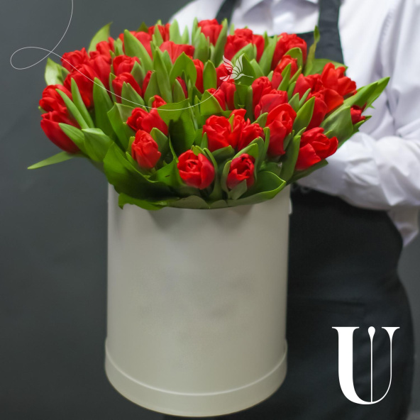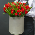 Большая композиция из кремовых кустовых роз Яна, белых эустом и кустовых пионовидных роз Бомбастик в шляпной коробке