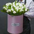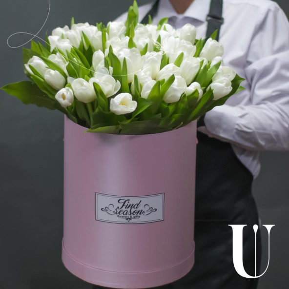 Композиция в белых тонах из роз Аваланж в шляпной коробке