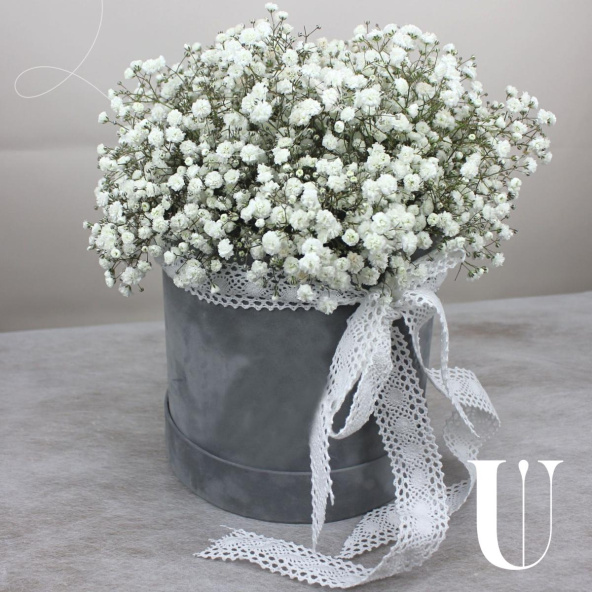 Композиция из микса нежных гортензий в белой шляпной коробке