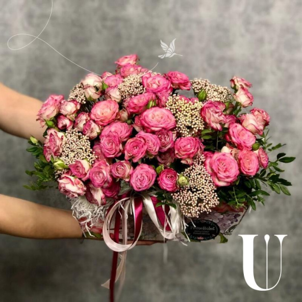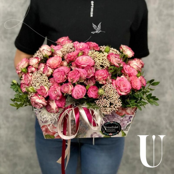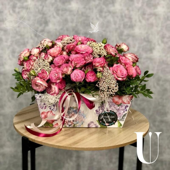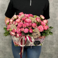 Лизиантус, кустовая роза и альстромерия в подарочной коробке