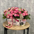 Нежная дизайнерская композиция из роз, гвоздик и гортензии в шляпной коробке