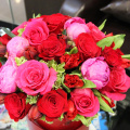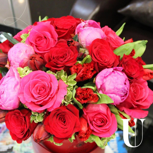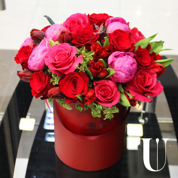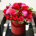 - Коробка шляпная - 1 шт., оазис флористический - 1 шт., пион - 5 шт., питтоспорум нигра - 3 шт., роза - 15 шт., тюльпан -5шт