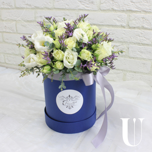 Букет из белых кустовых хризантем и лавандового лагуруса в голубой шляпной коробке