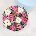 Композиция из диантусов, роз, лизиантусов и других цветов в белой шляпной коробке
