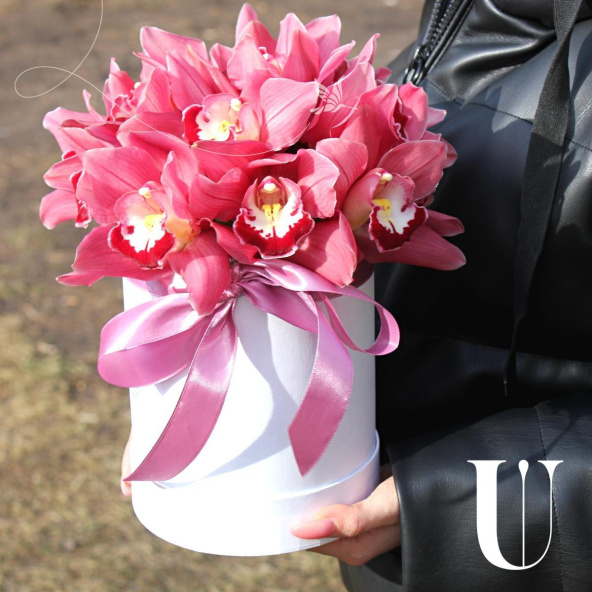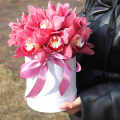 Розовая гортензия и белая гипсофила в розовой шляпной коробке