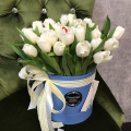 Цветочная композиция из кремовых диантусов и белых эустом в коробке