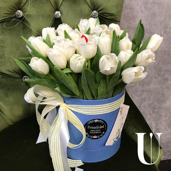 Композиция из белой и розовой гипсофилы в шляпной коробке маджестик