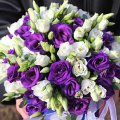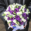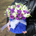 Композиция из роз, диантуса и лизиантуса в шляпной коробке