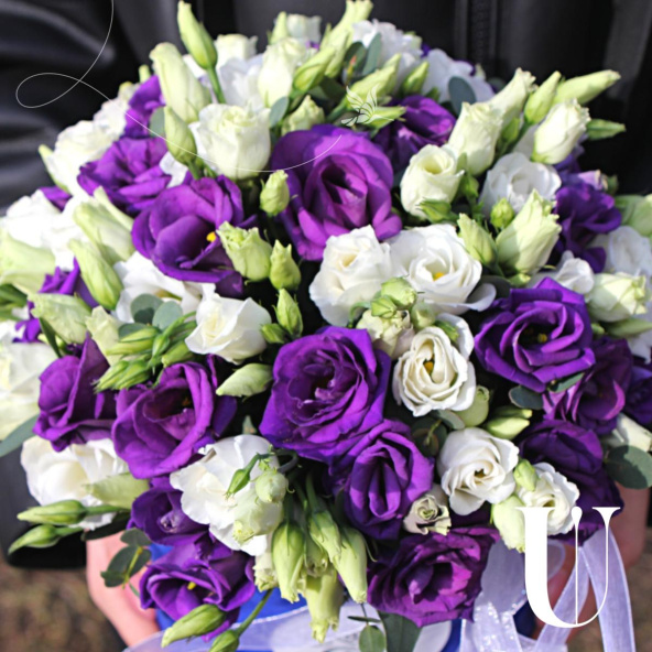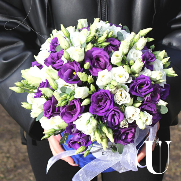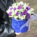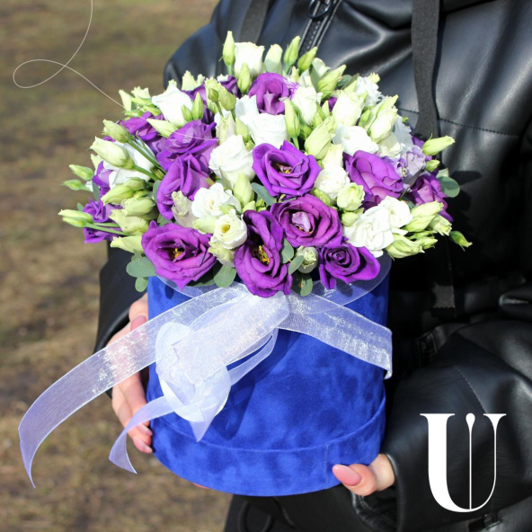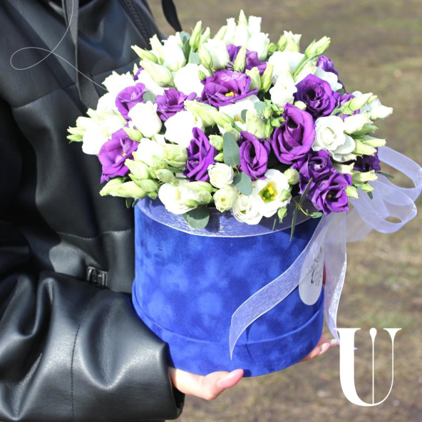 Композиция из кремовых диантусов и белых эустом в синей шляпной коробке